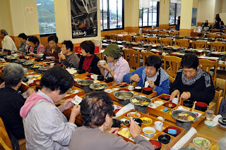 ここから約30分でまつりの森に到着。ここで1基3千万円のミニチュア屋台10基の並んだ展示場を進み、実物の屋台数基を見学した。この屋台は1基3億円もするとか。精緻な細工を施した大型の屋代は、あまりにも高価なのに驚いた。日本一大きな太鼓を打ち鳴らす人形を見学し、食堂へと向かった。