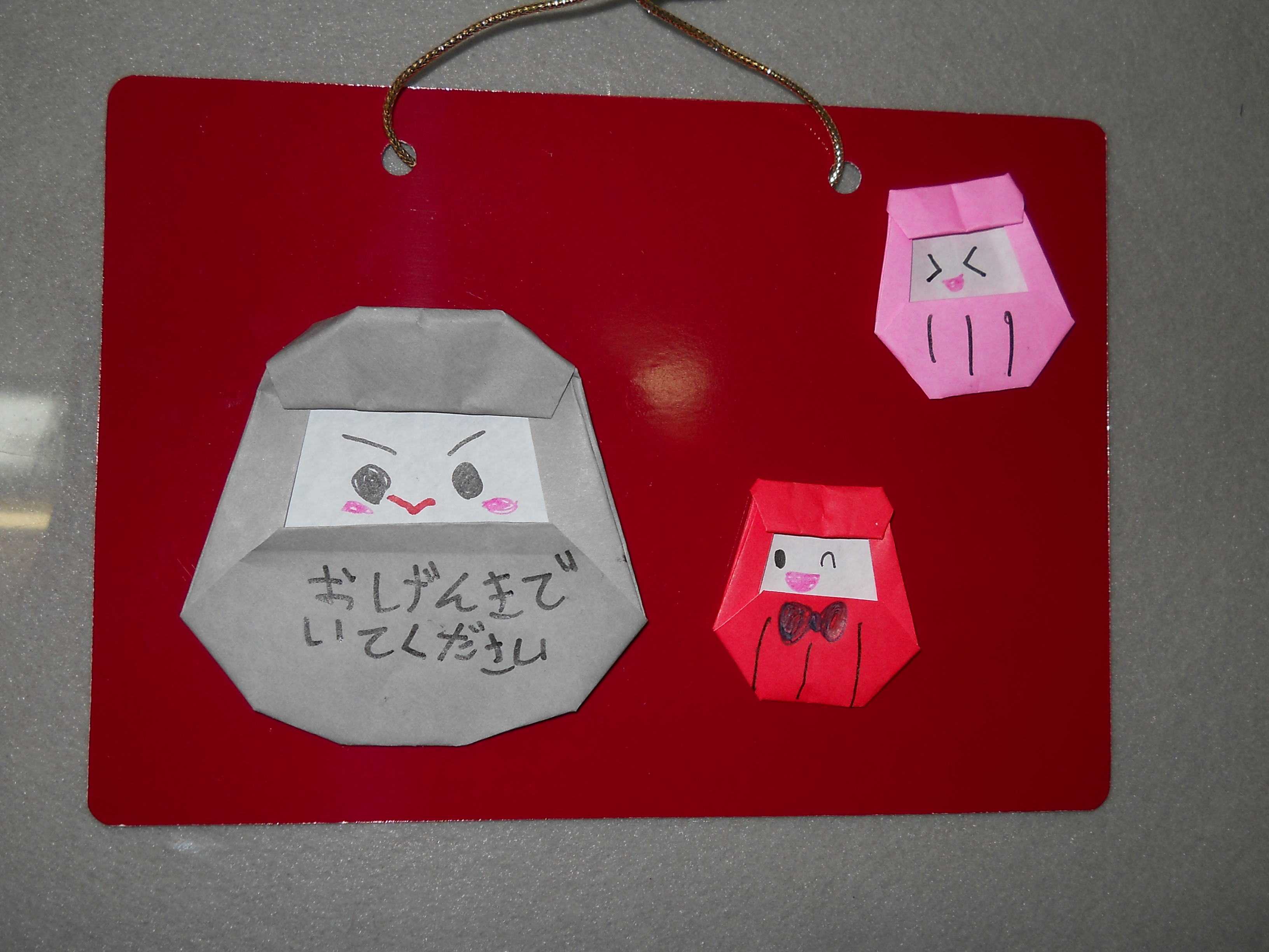 千坂児童館の子どもたちが、一人暮らしのお年寄りにプレゼントするため、折り紙のだるまを作りました。3月20日に民生委員の方に届けてもらう予定です。